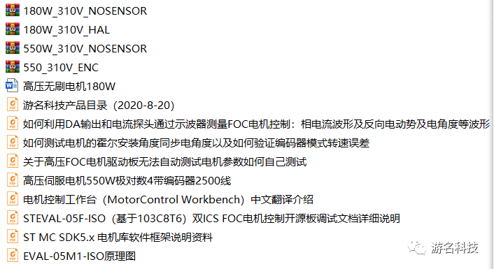 提供资料清单: 1、550W伺服电机:无感/有感编码器参考程序; 2、180W直流无刷电机:无感/有感霍尔参考程序; 3、参考板子教程及PDF原理图; 4、游名科技ST FOC参考培训资料;